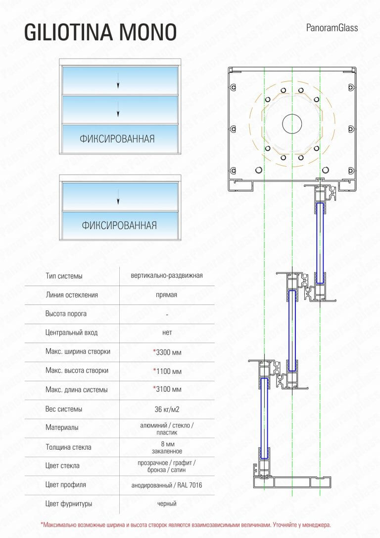 В системі GILIOTINA MONO використовуються виключно якісні алюмінієві профілю, армований сталевими нитками італійський ремінь і електропривід BEСKER виробництва Німеччини з крутним моментом в 120 Н / М, що дозволяє встановлювати стулки великих розмірів.